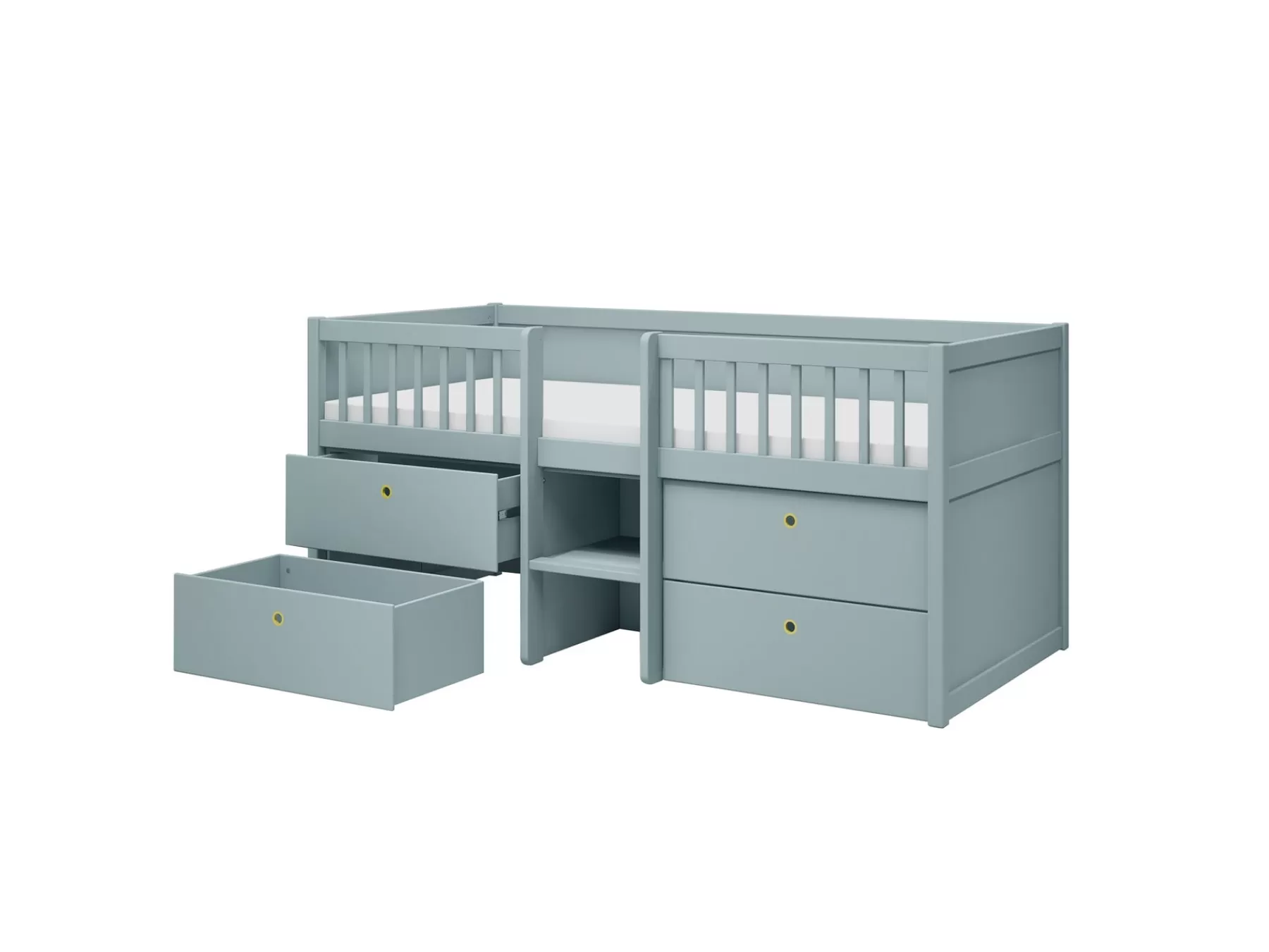 La petite échelle au milieu du lit permet aux enfants de monter et descendre seuls en toute sécurité. La barrière, qui ne peut pas être enlevée, garantit la sécurité de l’enfant pendant son sommeil.